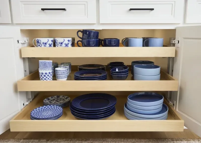 We replace the 1/2 shelf in your cabinet, white wire racks in your pantry with a smooth, quiet glide-out storage system that is custom fit to your existing cabinets or storage space.